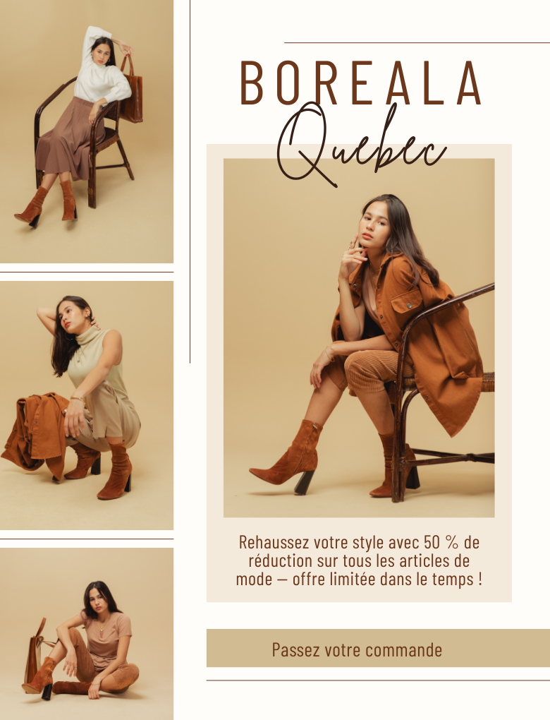 Créée ici et portée partout, notre boutique en ligne est née au Québec avec la volonté d’offrir des articles de mode, des chaussures et des vêtements qui combinent style, confort et qualité. Nous croyons en une mode accessible, pensée pour le quotidien, capable de s’adapter à tous les rythmes de vie et à toutes les saisons.